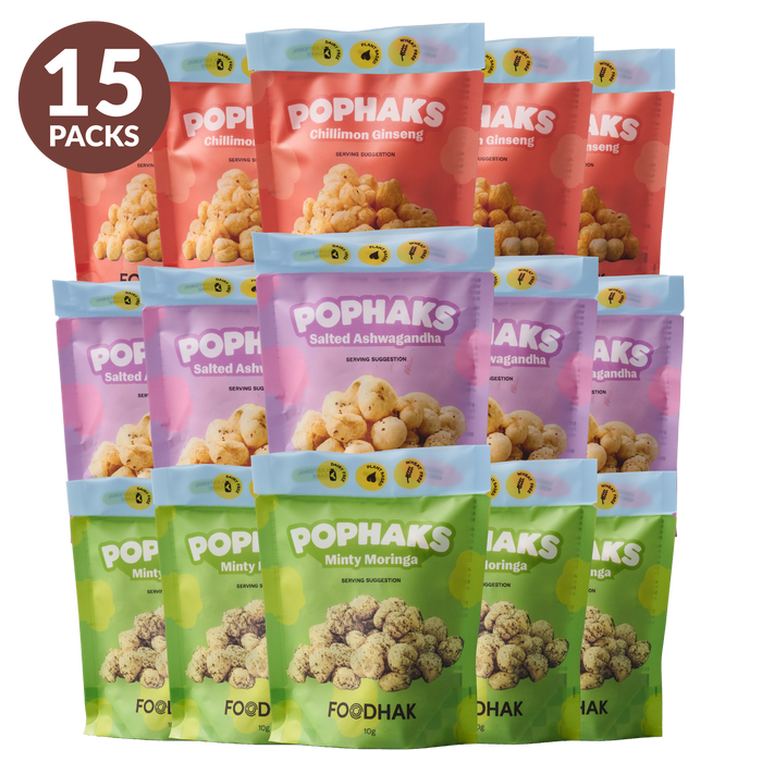 Need light bites on the go? We've got you covered! Try our crowdpleaser Pophaks in all three flavours, Chillimon Ginseng, Minty Moringa and Salted Ashwagandha - now in mini sizes. Just grab a handy snacking bag and you're set for the day ahead. All free from gluten, dairy, preservatives but completely irresistible.