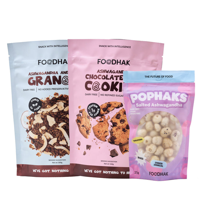 Relax, unwind, and nourish your body with the Stress Relief Bundle, a carefully curated selection of functional snacks designed to help you feel calmer while still enjoying the delicious flavours you love. Packed with nutrient-rich ingredients and powerful superfoods, this bundle makes it easier than ever to support your wellbeing while snacking smarter. From calming ashwagandha granola and cookies to our signature Pophaks, every bite is crafted to balance taste and function. Whether you need a mindful snack during a busy day or a moment of calm in the evening, this bundle has something satisfying for every craving. Discover the perfect blend of stress-supporting ingredients, great taste, and convenient healthy snacking, all in one bundle.